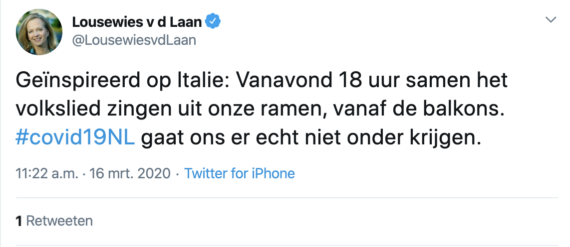 Hahahaha de absolute tandjes, wat is DIT nou weer. Vanavond lekker de nationalistische slofjes aan & saamhorig met z'n allen het volkslied uit het raam balken omdat Lousewies van der Laan dat wil. Mens ga toch koken. Maar hé, misschien kan ze bij OP1 met die lekker recalcitrante presentatoren eventjes haarfijn uitleg geven over dit hartverwarmende en spontane initiatief. Dan volgt heel Boomerland straks gedwee de instructies van Lousewies van der Laan, old boys network-mevrouw (nog nazoeken, red.) met de uitstraling van een leeg supermarktschap waar vroeger de wc-papier stond, die D66 in 2006 bijna in de afgrond stortte en sindsdien een vrouw van het volk is, member of the board van dit en lid van de board van dat, maar zich nu opwerpt als Verbinder des Vaderlands. Leuk idee hoor Loesje, maar wij zingen vanavond gewoon Gerrit Pardoels.