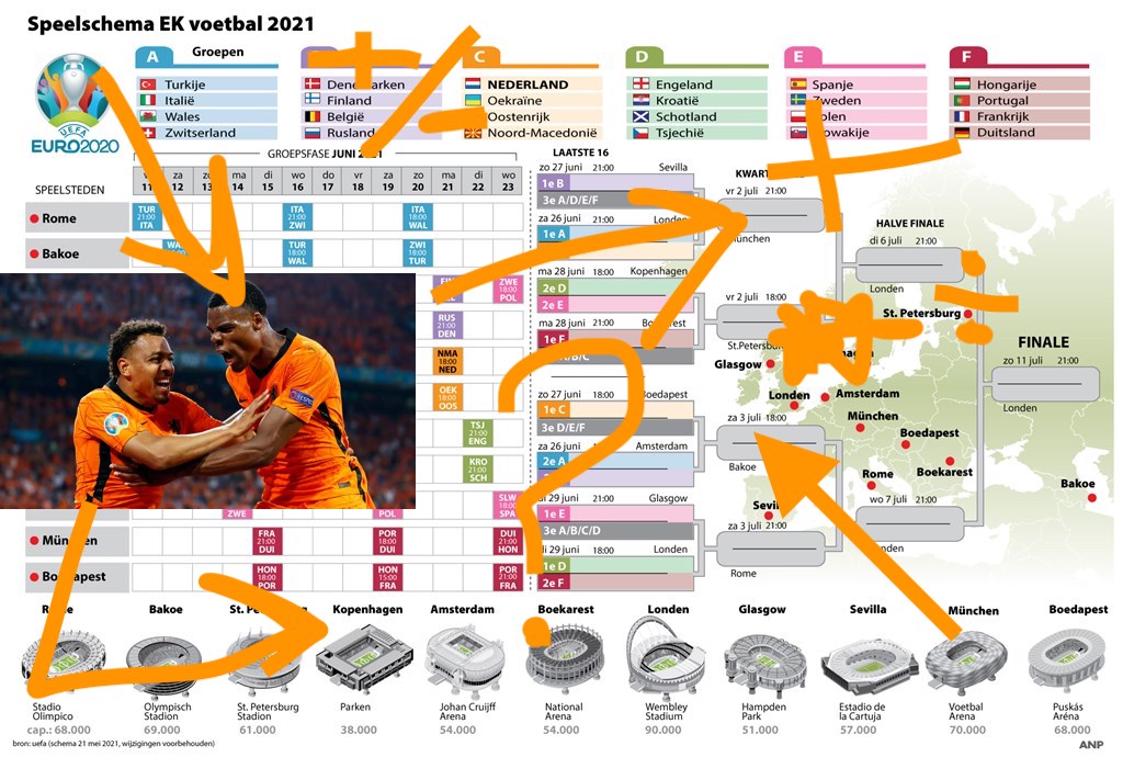 Wat we wel weten: Nederland is groepswinnaar op het EK en speelt op 27 juni in Boedapest de tweede ronde tegen een nummer 3 uit een andere poule. Wat we niet weten: of die tegenstander uit groep D, E of F komt. En dat maakt nogal veel uit, aangezien in groep F Frankrijk, Portugal en Duitsland spelen. Dat zijn de wereldkampioen van 2018, de Europees Kampioen van 2016 en de wereldkampioen van 2014. Die wil je ontwijken. En dat kan gelukkig ook. Volgens uw Telegraaf lezende oom hangt het allemaal af van een erg ingewikkeld schema, maar zo ingewikkeld is dat schema helemaal niet. Dat gaan we na de breek even rustig uitleggen, maar als u daar geen zin in heeft en toch snedig uit de hoek wilt komen, hoeft u alleen het volgende te onthouden: **Zwitserland-Turkije cruciaal, het liefst een gelijkspel, anders een kleine overwinning van de Turken. En hup Hongarije. **