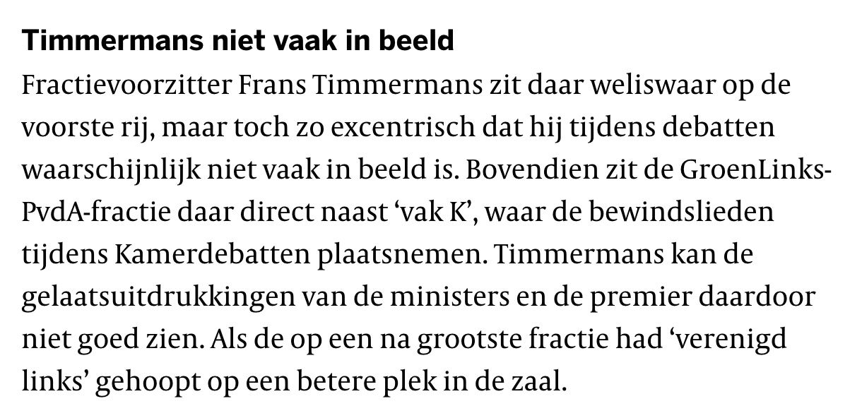 Van ons. Voor u. Een foto van Frans Timmermans (rechtsonder - red) op z'n GLPvdA-werkplek in de Vergaderzaal. Gewoon bewaren, want u gaat Frans maar weinig zien komende kabinetsperiode. Want Frans zit in de hoek waar de klappen vallen de camera niet komt. Extreemlinks en buiten beeld voor de livestreams dus. Schuld van de uitmiddelpuntige excentrie in Den Haag, waarbij Frans ook nog eens Vak K niet in het gezicht kan kijken. Aldus een hevig teleurgestelde Volkskrant. Arme Frans. Dat worden vier hele lange jaren...