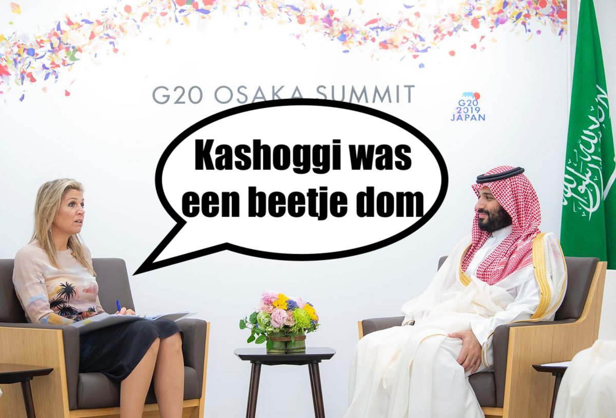 De Nederlandse koningin Máxima, wier vader nog heeft gewerkt voor een budget vliegtuigmaatschappij, heeft in Osaka een gezellig onderonsje gehad met Mohammed bin Salman, de zoon van een Arabische vleesverwerker. Geheel onverwacht is de Tweede Kamer daar helemaal niet blij mee. De foto van de ontmoeting is afkomstig van het Saoedische PR-bureau, dus die kunnen binnenkort een brief op hoge poten van de RVD verwachten. Iedereen weet immers dat ontmoetingen van Koningin Máxima met mensenrechtenschendende dictators buiten de mediacode vallen. Kijk bijvoorbeeld hoe het ANP dat doet. Helaas pindakaas CIC Saudi Arabia, jullie kunnen een prominent plekje tijdens het volgende fotomomentje in Lech mooi op je buik schrijven!