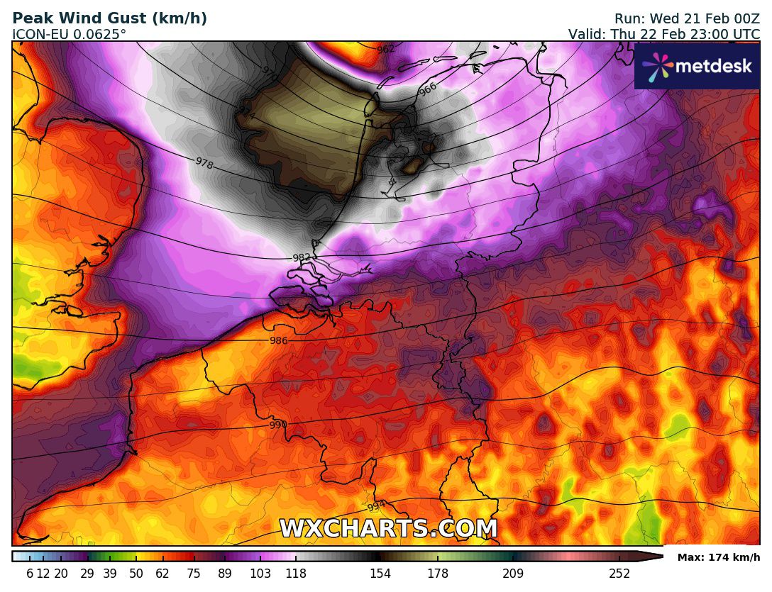 Landgenoten, en die in het Bijzonder Provinciaal Landschap van Noord-Holland in het bijzonder. U bent gewaarschuwd. Het gaat spoken donderdagavond. Meerdere meteo-diensten alsook het KNMI melden een uitzonderlijk zware februaristorm voor morgenavond 22 februari. Zelfs het omstreden categorisch misperende weerprimeur, dus maakt dan de borst maar nat. Vooralsnog is het CODE GEEL, maar als we bovenstaand kaartje mogen geloven wordt het eerder CODE GRIJS tot CODE ZWART. Gelukkig staan de Noordzee-strandpaviljoens nog in de winteropslag. OH NEE WACHT. Monsterstorm wordt voorafgegaan door pittige regenbuien in het westen des lands en de daarmee gepaard gaande monsterfiles. Sterkte & blijf WEG van bomen.