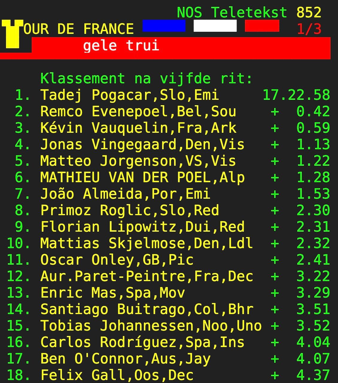 Zo. En dan nu het echte werk. Even geen valpartijen (alhoewel) maar een secondenstrijd der giganten. MVDP zei gisteren dat hij "realistisch" moest zijn, maar wat hij er niet bij vertelde dat hij van de winter in windtunneltjes getraind heeft, want Mathieu kan best wel prima tijdrijden. Rond half zes weten we of Van der Poel opnieuw het geel heeft. LIVESTREAM