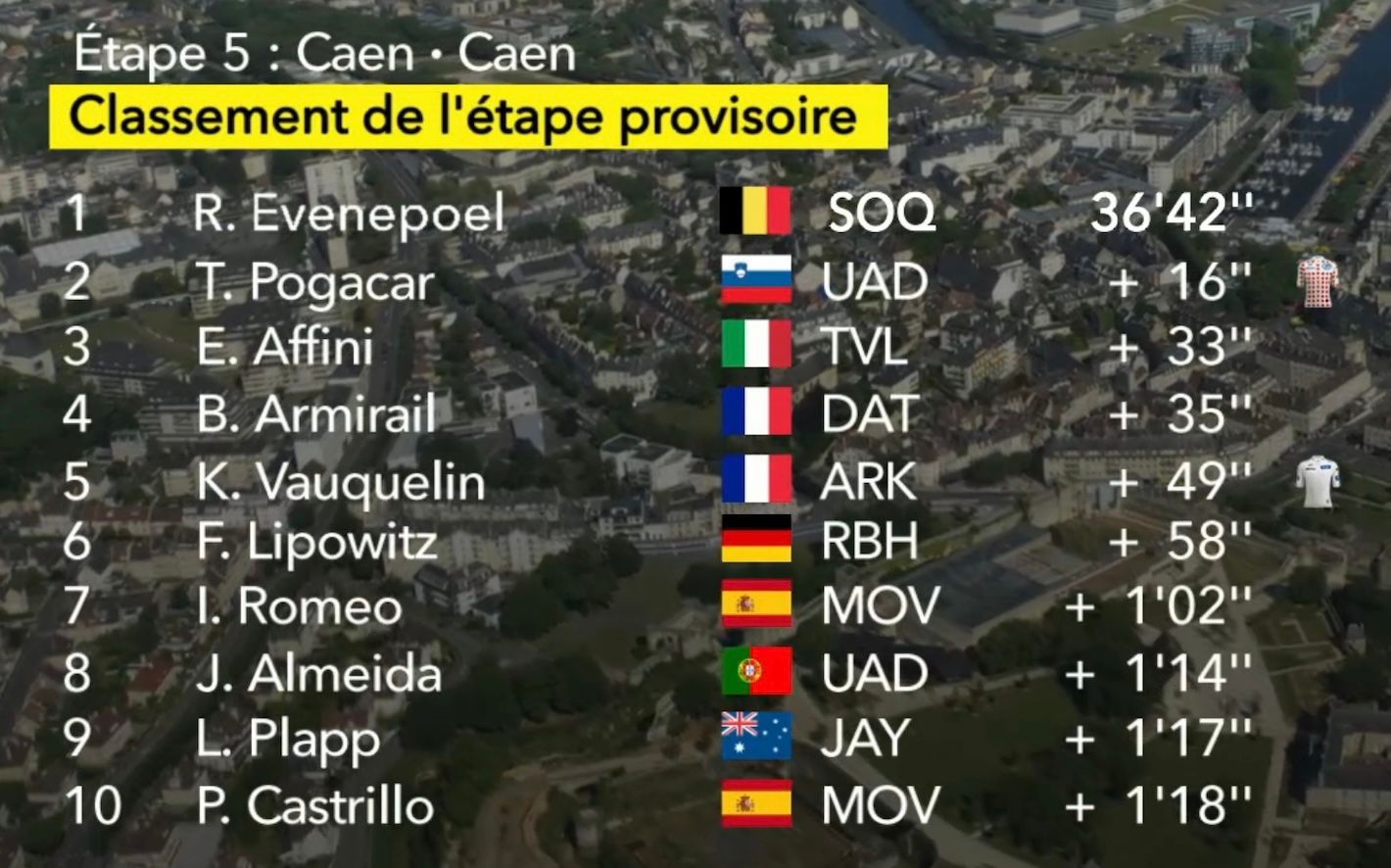 Update: EVENEPOEL (wereldkampioen tijdrijden) WINT. Geel voor Pogi.