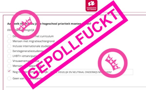 Afschuwelijk nieuws. De Kring van Hoofdredacteuren van Hoger Onderwijsmedia (die bestaat echt, red.) heeft besloten te stoppen met de landelijke enquête naar diversiteit en inclusie. Dit alles na een topic op de verschrikkelijke website GeenStijl.nl met een zogeheten hyperlink naar de enquête, waarin deelnemers onder meer werd gevraagd of ze weleens 'vijandig zijn aangestaard'. Een moedige beslissing van de Kring, die voor het organiseren van deze enquête een subsidie (!) ontving van het Stimuleringsfonds (!) voor de Journalistiek (!).