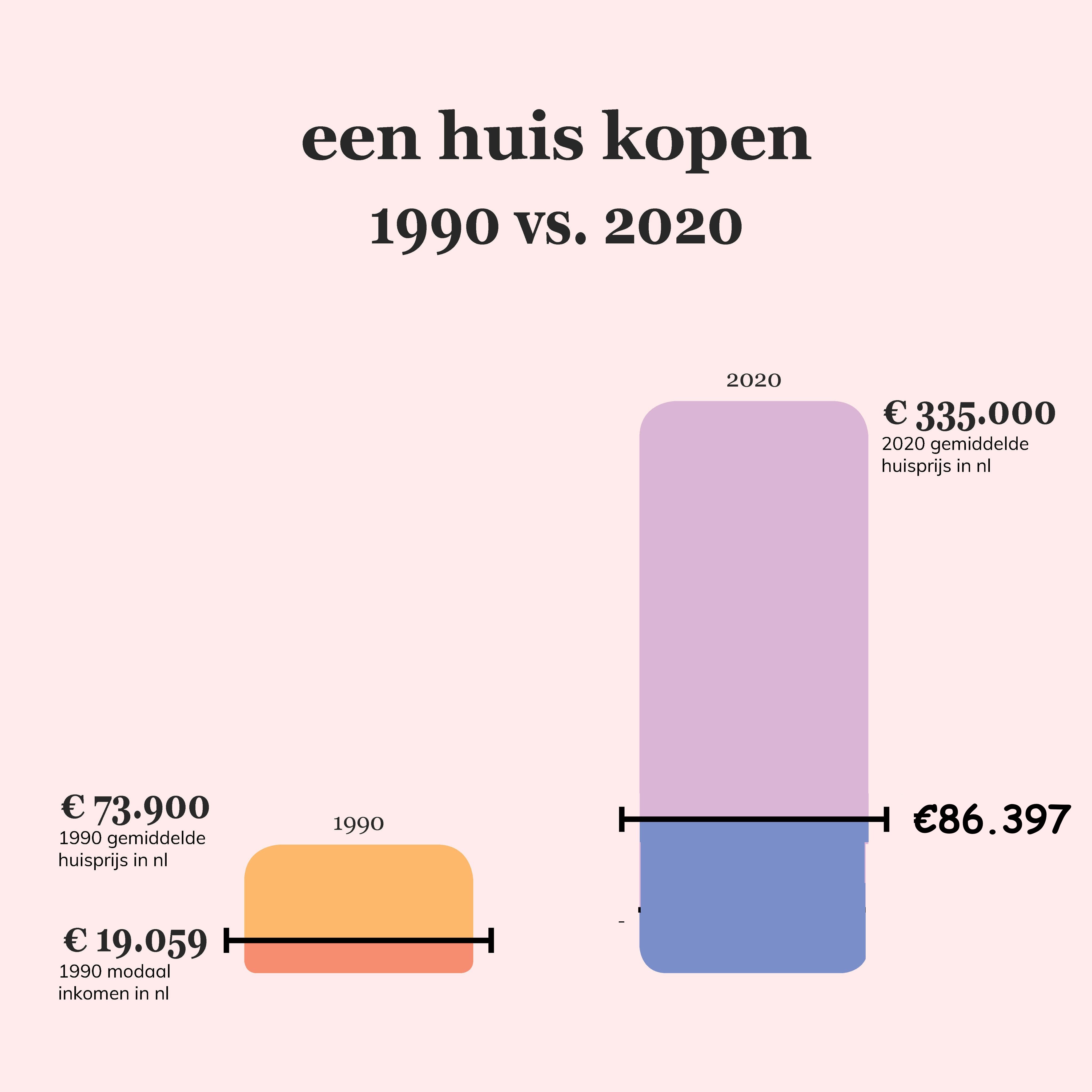 Om de fout te laten illustreren doen we een experiment: stel dat het modale inkomen in de periode tussen 1990 en 2020 met precies dezelfde verhouding gestegen zou zijn als de huizenprijs. Het modale inkomen zou dan op €86.397 (damn, red.) per jaar uitkomen. Als je de opmaak van de grafiek hetzelfde houdt, krijg je ongeveer dit: