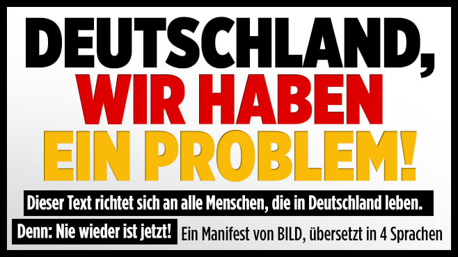 Geen woord Spaans bij & don't mention the islam. Een manifest in vier talen (Arabisch, Turks, Moelands, Engels) voor eenieder die anno 2023 in Duitsland leeft. Soort van Artikel 1, maar dan 50 x uitgelegd aan middeleeuwse erichvonderbürger die lopen te rellen, treiteren, vuurwerkbommen gooien, agenten aanvallen tijdens Pallie-demo's in Merkelland waar met ISIS- en Talibanvlaggen wordt gewapperd, en waar om DE DOOD van het gansche Joodsche volk wordt geroepen. Ja weet u, die Duitsers hebben daar nare ervaringen mee & Nie Wieder Auschwitz zit daar nu in de fatsoenlijke volksziel gebeiteld. Oke, er zijn nog wat ouderwetse Rijksburgers en overige snorren en rechterarmen. Maar nu Het Probleem opduikt bij De Asielinstroom is het bij Bild Zeitung Vijf over Twaalf en tijd om NEIN NEIN NEIN te zeggen.MANIFEST HIERRR. Helaas ontbreekt Punkt 51 bij Bild, dus hier een voorzichtige poging: Mocht u met voorgaande 50 punten een probleem hebben dan wordt u gratis naar de Sinaï gebracht. Keinen Dank. Tschüss und Tudeledoki.
