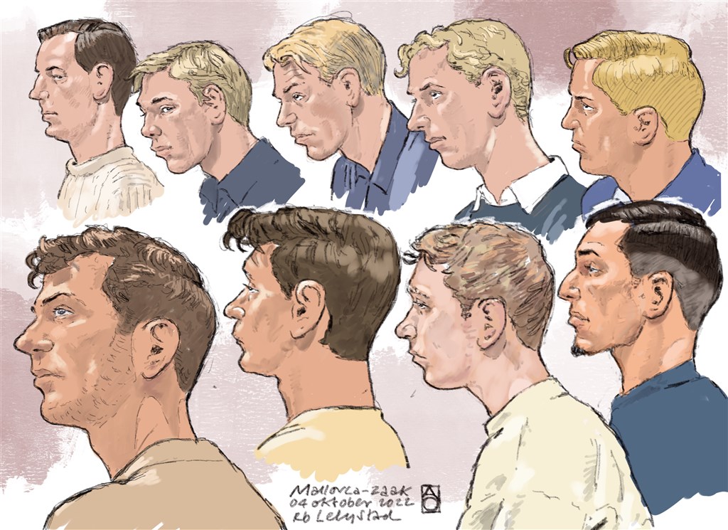 Vandaag de negende dag van de inhoudelijke behandeling van de zaak tegen de Mallorcaanse moordmachines, die gisteren behoorlijke straffen tegen zich hoorden eisen. Tien jaar brommen voor hoofdvogel Sanil Boughlalah, acht jaar voor Heintje 'of je nou een 10 haalt of een 6je, positiviteit haal je altijd uit een groen flesje' Busschers en ook acht jaar voor agressieve gek Mees Telkamp. Die Mees (compositietekening) zit vandaag weer in het bankje, naast zijn advocaat, om te vertellen waarom juist hij onschuldig is. Probleem alleen is: de kopschopkneusjes houden zich aan de omerta en vertellen niet wie het dan wél gedaan zou hebben. Ook voor de rechter vandaag voor de verdediging: Daan van Stapele, die anderhalf jaar cel tegen zich hoorde eisen, en Stan Franken, die 150 uur mag schoffelen. Zouden er, mede door de strafeis, eindelijk ANTWOORDEN komen voor die arme familie van Carlo Heuvelman? Tweets na de klik, later meer, updates volgen.