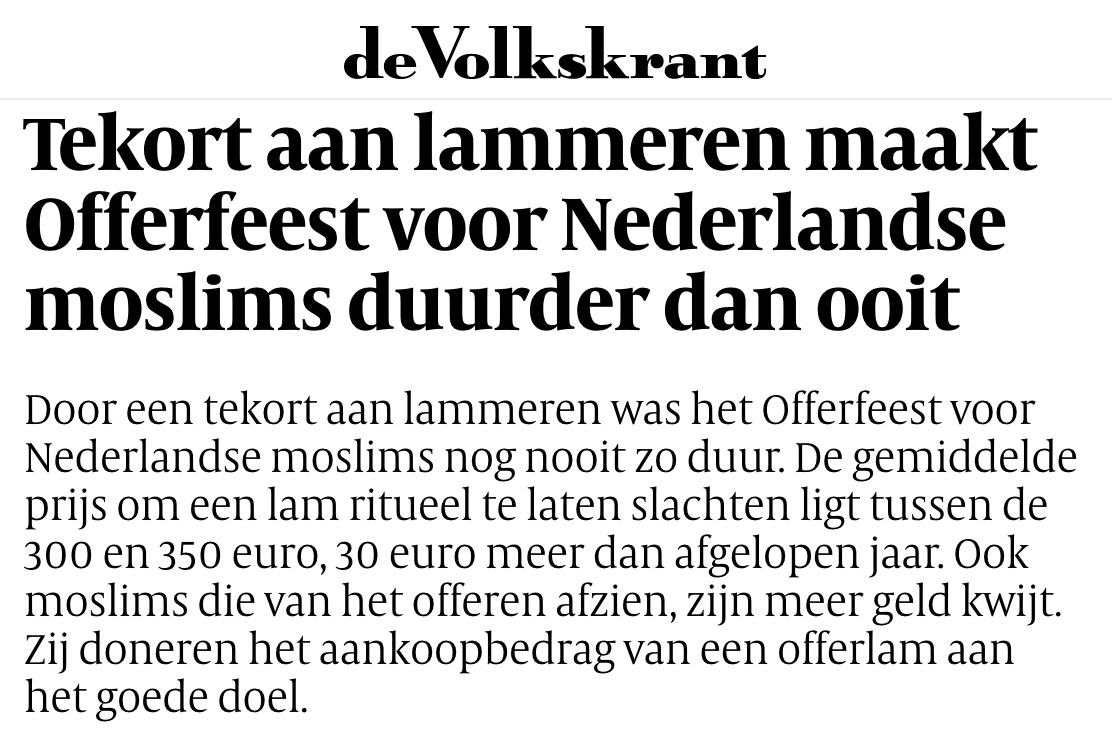 Het is deze hele week OFFERFEEST. Dat is een soort van Zwarte Piet, maar dan voor de moeslims. Het offerfeest is al jaren niet meer van deze tijd, maar dat durft bijna niemand te zeggen. En dus worden er anno 2021 nog steeds babyschaapjes onverdoofd doodgemaakt. Als fatsoenlijke krant zet je dan een zin als "Dierenwelzijnorganisaties pleiten al jaren voor een verbod op het ritueel slachten" in de tekst, en dan weer -pfoei- dapper door met wegkijken, de jacht op plaatjes van roze meisjesspeelgoed in reclamefolders, straatnamen met zeehelden en huidskleuren en piemels turven bij overheidsorganisaties. Maar de allerbelangrijkste zin uit het VK-verslag over het islamitische #BabyAnimalSlaughterFest21 is toch wel. Waren er in 2007 nog 1,3 miljoen schapen in Nederland, vorig jaar telde het CBS er nog ‘slechts’ 525 duizend. Hoera. Die klimaatdoelen gaan we halen!
