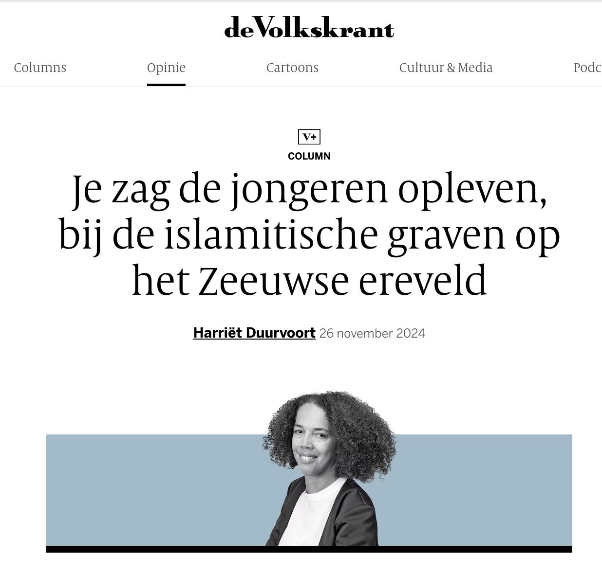 Voor u nu denkt... hebben we een islamitisch ereveld in Nederland? Nee, dat hebben we niet. Het ereveld in Kapelle (foto) is een Frans ereveld. In de Bange Meidagen van 1940 verliet het Nederlandse leger de stellingen in Zeeland en rende heel hard naar veiliger oorden. Het waren de Fransozen die de strijd aangingen met de veel beter uitgeruste Duitse stoottroepen. Er sneuvelden 84 Fransen. De burgerbevolking van Kapelle zorgde destijds voor de doden en gewonden, en nog steeds eigenlijk. De Noord-Afrikanen die in Kapelle begraven liggen, zijn arme sloebers die verzopen bij Duinkerken en aanspoelden langs de hele Noordzeekust, waarna ze zijn herbegraven in Kapelle. Dat staat ook wel in de armetierige Volkskrant-column van Harriet Duurvoort, maar in een summier bijzinnetje. Wat niet in de column staat is dat ze in Kapelle helemaal niet blij zijn met... onzekere moslimjongeren uit kwetsbare, arme milieus. Je zag ze opleven, bij de islamitische graven op het Zeeuwse ereveld. Verlegen gloeien van trots op helden die op hen hebben geleken. Voor wie de vlag werd gehesen. Duurvoort doet hier exact waar ze 14 jaar geleden in Kapelle ook al zo'n pleurishekel hadden: herdenken gebruiken voor politieke doeleinden. Uit de nog immer actuele HP/deTijd-reportage uit 2010. Marokkanen vochten niet in Zeeland (pdf).