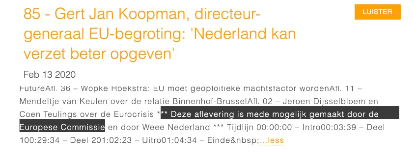 De goed verstopte sponsormelding "Deze aflevering is mede mogelijk gemaakt door de Europese Commissie" duikt bij recente BB-podcasts ook op bij een gesprek met Caroline de Gruyter, EU-mol die bij NRC Brusselblad werkt en die in de uitzending een complete orkestbak loftrompetten op de EU afsteekt. Voormalig Volkskrantcolumnnist en nu Europarlementariër voor FvD, Derk Jan Eppink, gaat vragen stellen in het Europees Parlement, want "EP wil subsidie voor zelf-promotie verhogen van 600 miljoen naar 1,8 miljard in meerjarenbudget." GeenStijl heeft vragen gesteld aan Jaap Jansen, maar die worden vooralsnog genegeerd. Misschien moeten we eerst betalen?