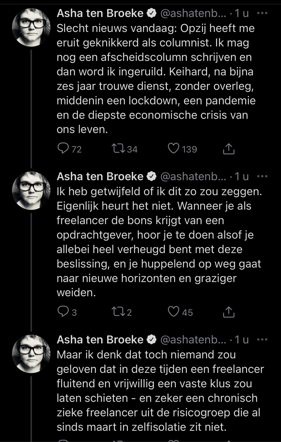 Gewichtig nieuws voor mensen die de columns van Asha ten Broeke in feministisch maandblad Opzij toch niet gelezen zouden hebben. Opzij gaat afslanken en mevrouw de stercolumniste, bekend van haar magnum opus 'dik zijn is heerlijk en ik kan het iedereen aanraden' (een claim betwist door cardiologen en gezondheidswetenschappers), gaat overboord. Als freelancer. Gewoon, binnen de lijntjes, risico van het vak, moeilijke tijd voor iedereen en we doen ff wat anders. Hartstikke vervelend enzo want ook Asha gunnen we een dikbelegde boterham. Jammer wel dat het dan weer moet gaan met rancune, slaande deuren en opgeheven middelvingers. Met gelul over een 'ik wil een revolutie', treinen naar horizonten en 'ze laten me ijskoud vallen'. Eerst al OneWorld (†) waar die vierhonderd woorden aan overprikkelde Weltschmerz niet meer welkom waren, en nu weer deze vechtscheiding. Stank voor dank, Opzij!
