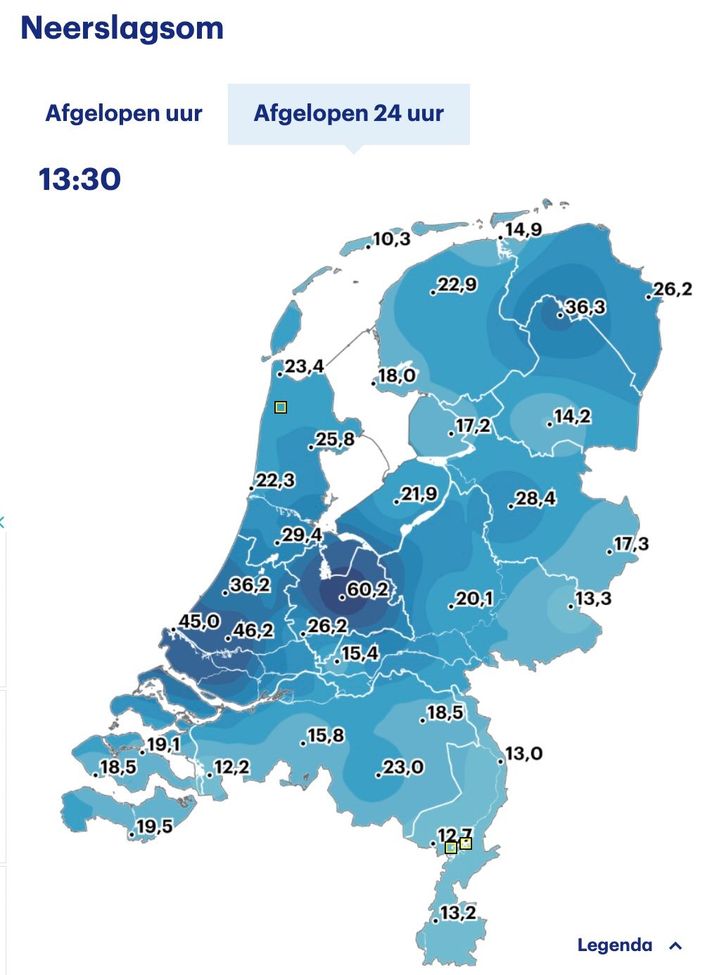 Zo mensen, de neerslagsom van afgelopen 24 uur, screenshot van hedenmiddag. Welja, 60,2 mm plons in het midden des lands (kan iemand checken of alles goed is bij Vitens Utrecht?) En er komt nog meer aan morgen en overmorgen. EEN HEUSE WATERBOM. Maak van die Code Geel maar Code Blauw, en zet het hele westen ramvol regentonnen en opzetzwembaden. Want wie wat bewaart, die heeft wat. Kunnen we in het voorjaar weer lekker tuinsproeien, de oprit Kärcheren en de auto wassen. Sterkte iedereen!