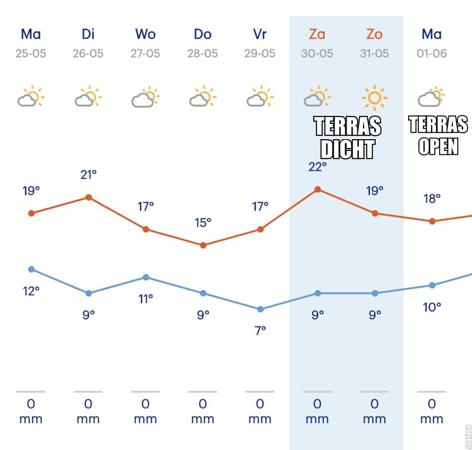 Weekvoorspelling van het 'gematigde' Buienradar (link). Als we andere weercowboys mogen geloven wordt het nog warmerder, nog zonovergotener en dik 25 plus komend UV-weekeinde. Bij de bouwmarkt is iedereen al geweest, bij het tuincentrum ook, dus drie keer raden waar Nederland heen wil met het Pinksterweekeinde. Naar HET TERRAS, dat pas op maandag 12:00 uur open gaat, onder zeer strenge en idiote voorwaarden. Denkt DE OVERHEID nu werkelijk dat DE MENSEN nóg een weekend binnenblijven? Denkt DE OVERHEID nu werkelijk dat DE HORECA zich nóg een weekend omzet door de neus laat boren? Hold your BOA's, beste Bruls. We hebben ons 9 weken voorbeeldig gedragen. Open het terras. Of anders...