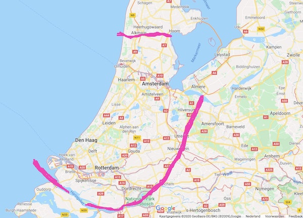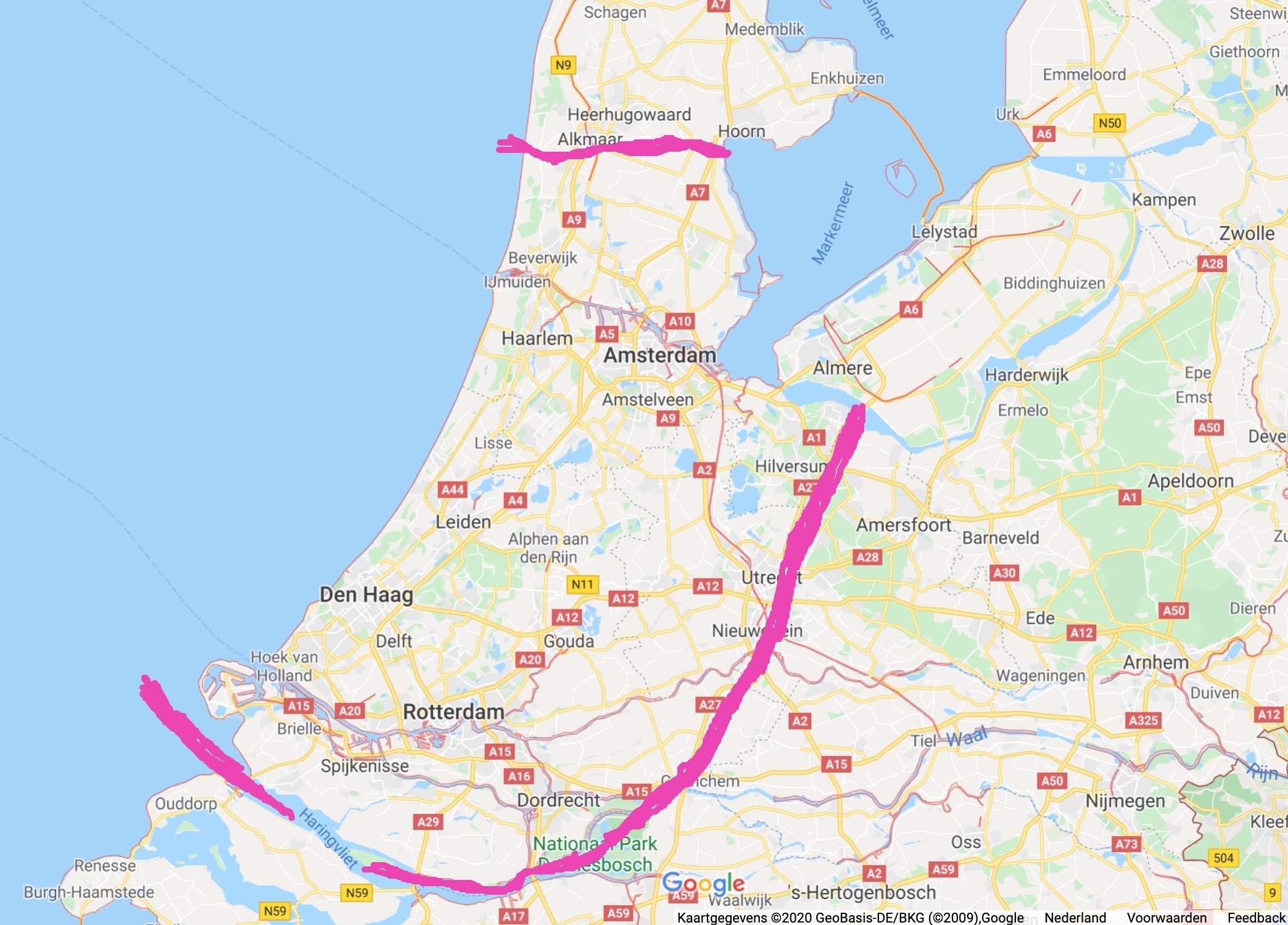Boem. Paukenslag. Eureka. De Oplossing. Een enorme giga-gracht (80 meter breed) die van het Haringvliet overgaat in de A27 (sorry Hank), en dan om Utrecht, Hilversum, Mediapark heen bij Eemnes omhoog. Jammer voor Huizen, maar daar wonen toch maar jihadi's. In Noord-Holland maken we de cut tussen Hoorn en Egmond, want Jan Roos in Bergen is dan wel een lul, maar hij hoort er wel bij.