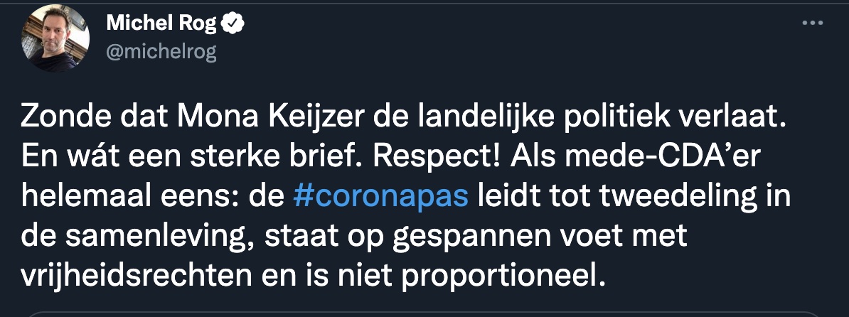 Zaterdag meldde oud-Kamerlid en wethouder in Haarlem Michel Rog (CDA) dat hij opstapt vanwege zijn bezwaren tegen die QRcode. Staatssecretaris Mona Keijzer werd zelfs ontslagen vanwege diezelfde reden. Beiden zijn/waren prominente CDA'ers. Gelijk hebben ze.