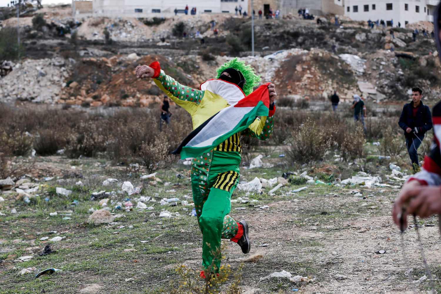 Oh nee, toch niet Piet. Het is Clown Gassie, de grappigste clown van de Westelijke Jordaan Oever. Met zijn kapotgrappige stenengooi truuk. Nou ja, we hebben gelachen. Volgende keer in een Pino-pak! Via ANP Photo. A masked Palestinian protester, dressed as a clown and holding a Palestinian flag, throws a rock towards Israeli security forces during clashes in the West Bank city of Ramallah on December 12, 2017, following the US president's controversial recognition of Jerusalem as Israel's capital. / AFP PHOTO / ABBAS MOMANI ©