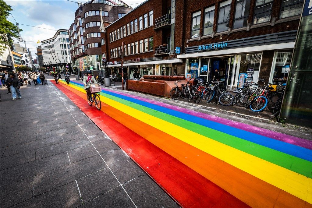 Grote Marktstraat in Den Haag heeft een gaybrapad, 's lands hardste symbool van tolerantie, liefde, D66 en levensgevaarlijk oversteken. Wanneer zal het ding beklad worden, en door wie?