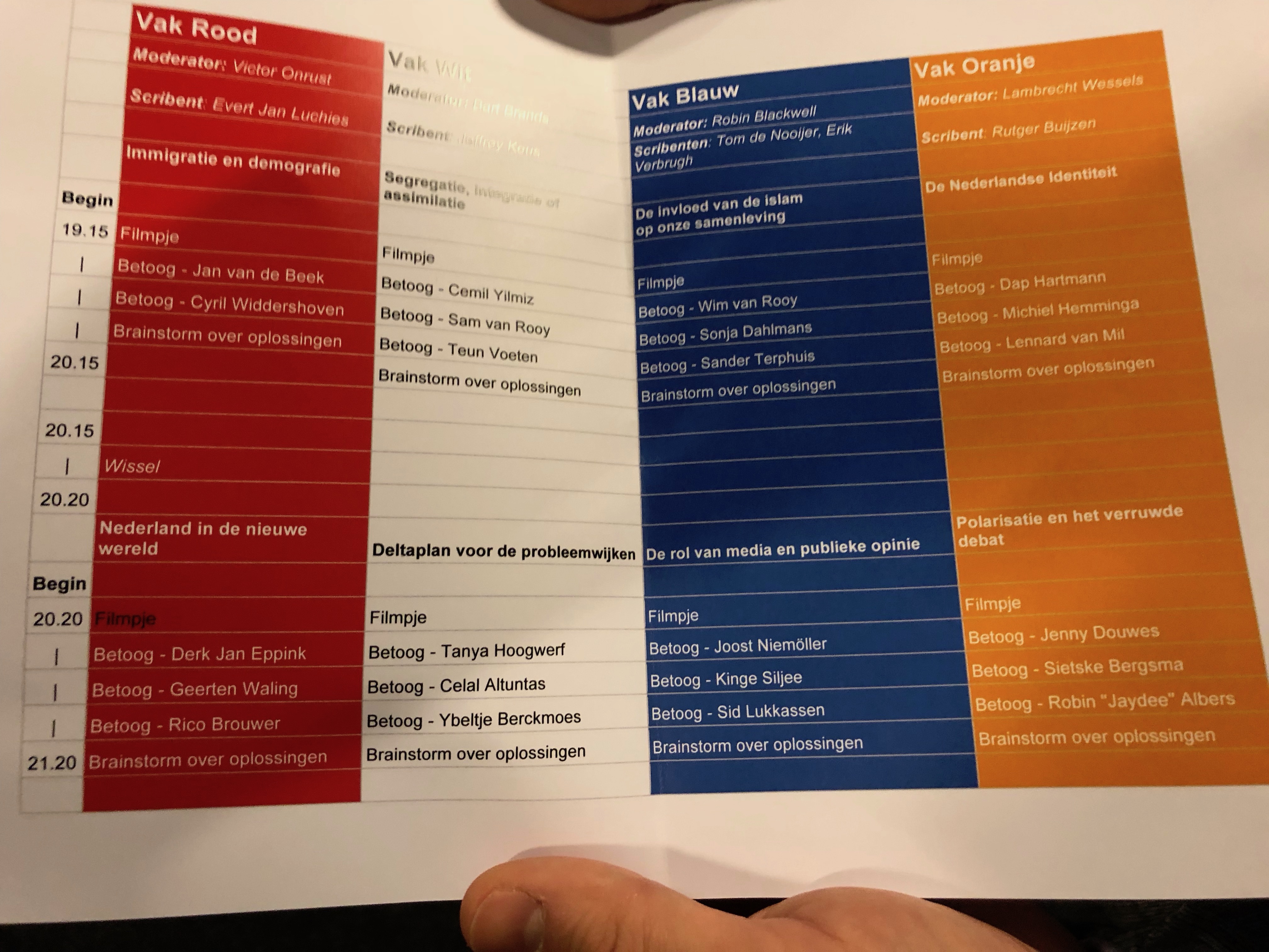 Aan het plafond hangen Nederlandse vlaggen. Voor aanvang van de eerste spreker - Adjiedj Bakas - staat het overwegend blanke, mannelijke publiek op om het Wilhelmus aan te heffen. Vrijwillgers dragen allemaal oranje. Jep, de Leeuw was Nederlands.