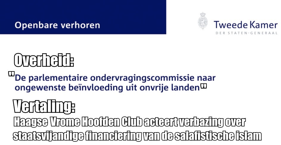 Afgelopen maandag begonnen de "openbare verhoren van de parlementaire ondervragingscommissie naar ongewenste beïnvloeding uit onvrije landen", vrij vertaald: hoe hard islamiseert Nederland, en wie betaalt dat? Er zijn zes verhoordagen die we allemaal live gaan volgen alhier. Want hoewel deze fopcommissie één grote Zeiden We Toch & Al Heel Lang Bovendien verbeeldt, is het best prettig dat al deze bekende informatie nu eens in een neutrale onderzoekssetting voorbij komt. Dan kunnen we het vanaf nu gewoon feiten noemen in plaats van meningen.