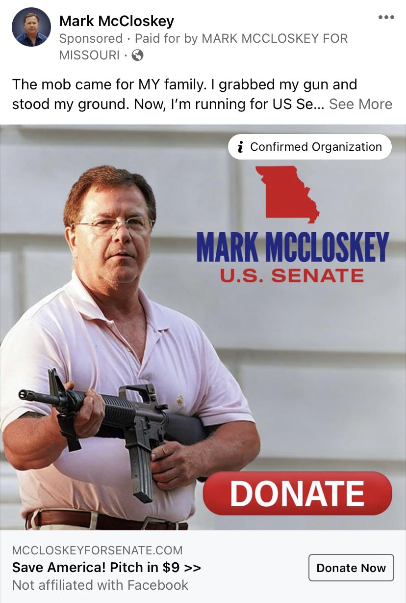 Één man met zijn rug tegen de muur, vinger langs (!) de trekker, oog in oog met de horde, bereid te sterven voor god, vaderland en uw zonden. Die man is Mark McCloskey en wij gaan op hem stemmen. U kent hem natuurlijk van het incident na de breek waarbij een menigte hem namens George Floyd kwam vragen of-ie z'n barbecue even uit de wind kon. En dat liep dus precies goed genoeg af om een jaar later voor de Senaat te gaan. De slogans schrijven zichzelf eigenlijk. 'I stood my ground, now I'm standing for you.' 'I made them run for their money, now let's make money run to you.' 'Yeah I got trigger discipline, now let's trigger some snowflakes into discipline.' 'Yeah I own a silencer, but I won't be silenced.' Meer slogans welkom in de comments!