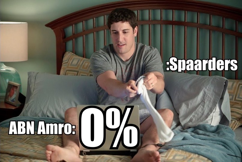 Het is officieel. Vanaf 1 april geven een ouwe sok, de bergruimte tussen de bankkussens, de vochtige plek onder het matras en je holle kies precies evenveel rente als ABN Amro. Namelijk: NUL PROCENT. Kleinere banken deden het al, de grootbanken staan in de rij. Wie meer dan 2,5 miljoen euro uit heeft staan (u allemaal, toch?) bij de voormalige staatssteunvangers, gaat zelfs negatieve spaarrente betalen. En wie voor een dubbeltje geboren is, zal vanaf 1 april altijd een dubbeltje blijven. Schuld van - ja, zegt u het maar. Het rentebeleid van de Europese Centrale Bank? De euro? Mark '1000 euro' Rutte? De wankelbanken in zwalkend Zuideuropië? Handelsoorlogen met China en sancties tegen de Russen? Donald Trump, misschien, of toch maar de Brexit? De koers van ABN Amro snelt uw rentestand in ieder geval vooruit: op naar de nul...
