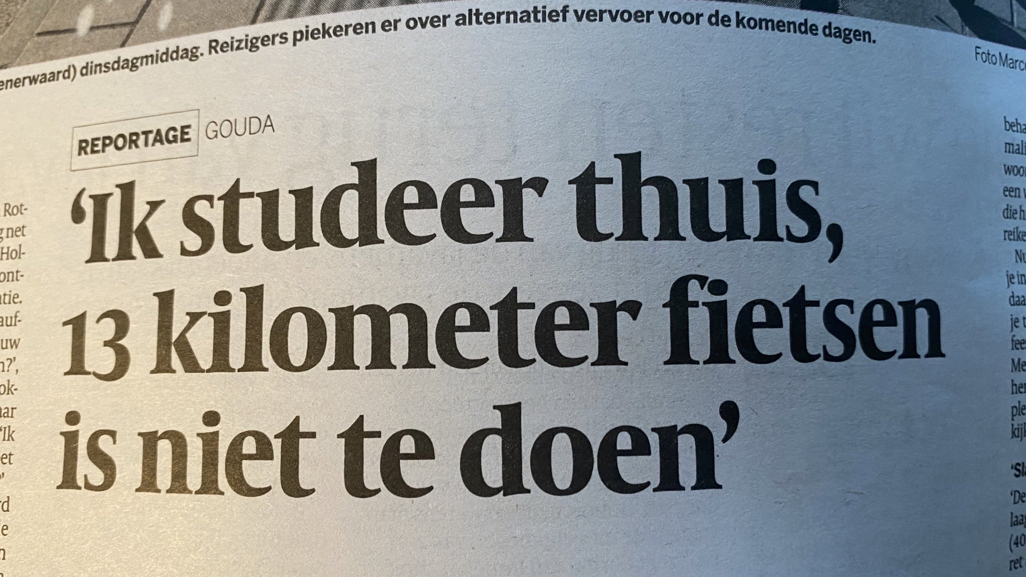 Er wordt GESTAAKT in het streekvervoer en dus moet Bart Scheer (21) he-le-fokking-maal van Bergambacht naar Gouda fietsen. FIETSEN. En u weet wat ze zeggen in Bergambacht: 'De Tour de France winnen is leuk, maar voor de rit van Bergambacht naar station Gouda verdien je pas echt een gele trui'. Het is namelijk: 13 kilometer. Dat zullen we eens uitschrijven en spellen: dertien kilometer. D, e, r, t, i, e, n, k, i, l, o, m, e, t, e, r. "Morgen studeer ik dus maar vanuit huis, want 13 kilometer fietsen is niet te doen."