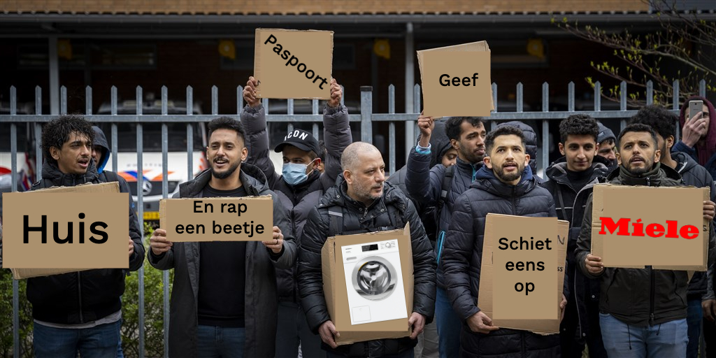 Nou makkers, het is officieel. Muitende asielzoekers, in Purmerend. Bedankt Nederland voor de piepers, maar we hoeven ze niet. "Het is nog onduidelijk voor de veiligheidsregio wat nu precies de eisen zijn van de hongerstakers, maar vermoeden dat ze een snelle asielprocedure willen." Gratiesj kanen is niet genoeg. Er moet TEMPO gemaakt worden. Voor een huis, Miele, loungebank, gasfornuis, tv met Netflix, sociale voorzieningen, integratieprogramma, trajectcoach dit, loopbaanbegeleider dat, cursus zus en natuurlijk paspoort zo. Want als je hier al 'maanden' zit, dan heb je voorrang. Maar ja. Als het je niet bevalt. GA DAN.