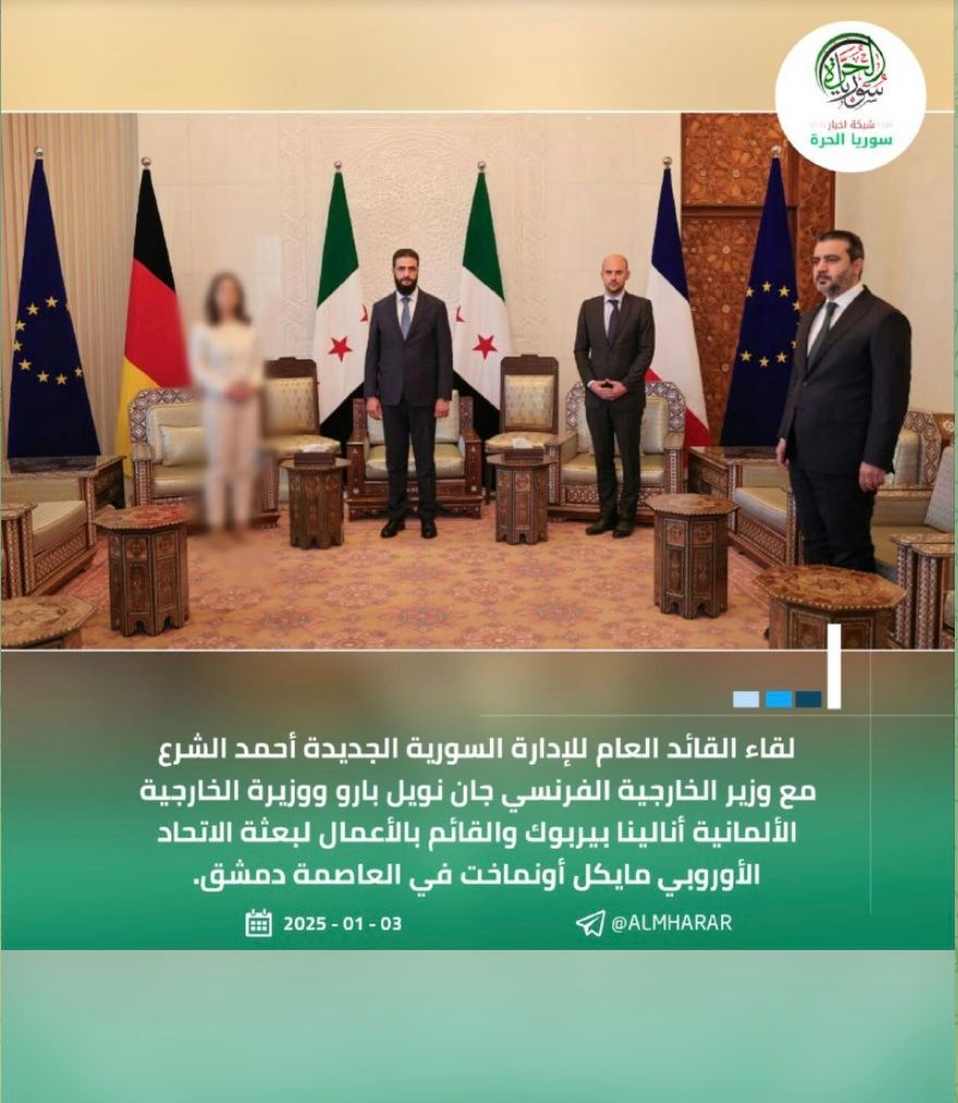 Gisteren zagen we al dat Annalena Baerbock, de BuZa-minister van Duitsland, keurig geen handje kreeg tijdens een staatsbezoekje aan Nieuw-Syrië van Jolani, en vandaag zien we op het Telegram-kanaal van nieuwsdienst ALMHARAR (zeg maar het Trouw van de regio) dat de bevallige Baerbock ook maar meteen weggegumd wordt. Eh... dames. Nu niet meteen boze manifesten naar de krant sturen en adverteerders bellen enzo. Jong land moet weer opgebouwd worden, en dat gaat natuurlijk niet met een harde klabanus in de werkbroek cq werkjurk.