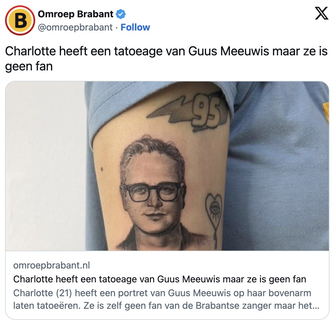 "Charlotte (21) heeft een portret van Guus Meeuwis op haar bovenarm laten tatoeëren. Ze is zelf geen fan van de Brabantse zanger maar het doet haar denken aan haar vader, die trouwens ook geen fan is van Guus."