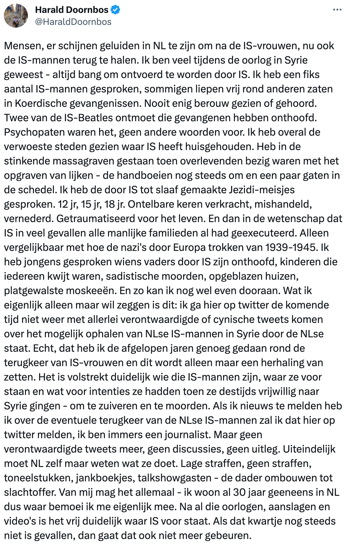 Meerdere colleges gaf onze favoriete docent Ingewikkelde Internationale Betrekkingen Harald Doornbos over de terugkeer van IS'ers, tot voor kort voornamelijk vrouwen. Zoals hier, en hier, maar natuurlijk ook op X. Meerdere keren schetste hij zijn verbazing over de gastvrijheid waarmee die staatsgevaarlijke gekken met Yesilgöz Travels en Bolkestein Airlines werden teruggecharterd naar de Polderbaan. En het is niet alleen de overheid, het is ook de media, met dit soort gelul - terugkeerders krijgen in Nederland een premiumabo NRC en als ze zielig genoeg zijn een televisieserie van de NPO, een heus toneelstuk en een pak geld om hagelslagtranen te mogen huilen op de schoot van Margriet. Welnu, de mannetjes willen nu ook terug. U weet: de vrouwtjes zetten alleen maar thee, de mannetjes brachten die thee rond. In een vlammend betoog op X maakt Doornbos korte metten met dat narratief, maar er overheerst toch vooral gelatenheid. Nederland luistert toch niet, ze komen toch wel, ze krijgen toch een fopstraf en dan lopen ze toch gewoon weer rond, met de slotzinnen als definitieve onthoofding van Nederland: "Uiteindelijk moet NL zelf maar weten wat ze doet. Lage straffen, geen straffen, toneelstukken, jankboekjes, talkshowgasten - de dader ombouwen tot slachtoffer. Van mij mag het allemaal - ik woon al 30 jaar geeneens in NL dus waar bemoei ik me eigenlijk mee. Na al die oorlogen, aanslagen en video's is het vrij duidelijk waar IS voor staat. Als dat kwartje nog steeds niet is gevallen, dan gaat dat ook niet meer gebeuren." Amen.
