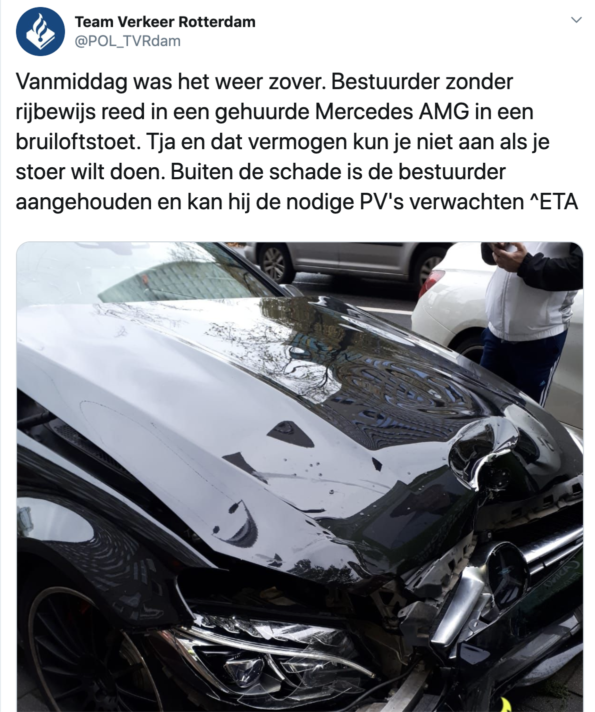 Hoppa we hebben er weer een, in navolging van de Lambo-crasher! Een poepvervelende trouwstoetloser die zijn stomme huurbolide in de prak jengelt. Nu is het weliswaar zonde van de Mercedes, maar die bak zat toch al in de verhuur en was dus toch al veroordeeld tot een leven lang ellende, ongemak en onnodig claxongebruik. Deze brokkenpiloot in Rotterdam had niet eens een rijbewijs. "Ze deden heel stoer, continu van weghelft wisselend", aldus een ooggetuige. Karma is a bitch, toetersukkel. Volgende keer gewoon weer lekker in de Fiat Panda van je pappie.