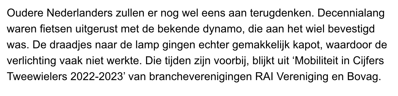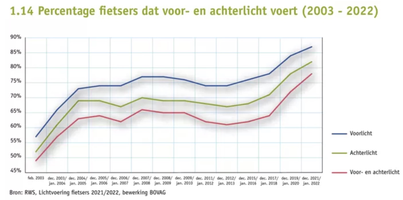 Hoera! Er gaan ook dingen goed in Nederland Crisisland, waar iedereen maar om staatssteun zeurt. Voor- en achterlicht op uw fiets bijvoorbeeld. Er is potjandorie zelfs een INFOGRAFIEK over het fietslampjesgebruik 2003 - 2022. Kiek dan! We zitten potdomme bijna op de 90 procent voorlicht! En zo werd het toch nog veilig verkeer op de weg. Kleine correctie voor de DPG postmillennials die nog nooit een dynamo van dichtbij hebben gezien. Dat dynamoding zat aan het frame danwel de vork (de elite had 'm in de naaf) en niet aan het wiel. Oké, nog 1 x DE REGELS.
