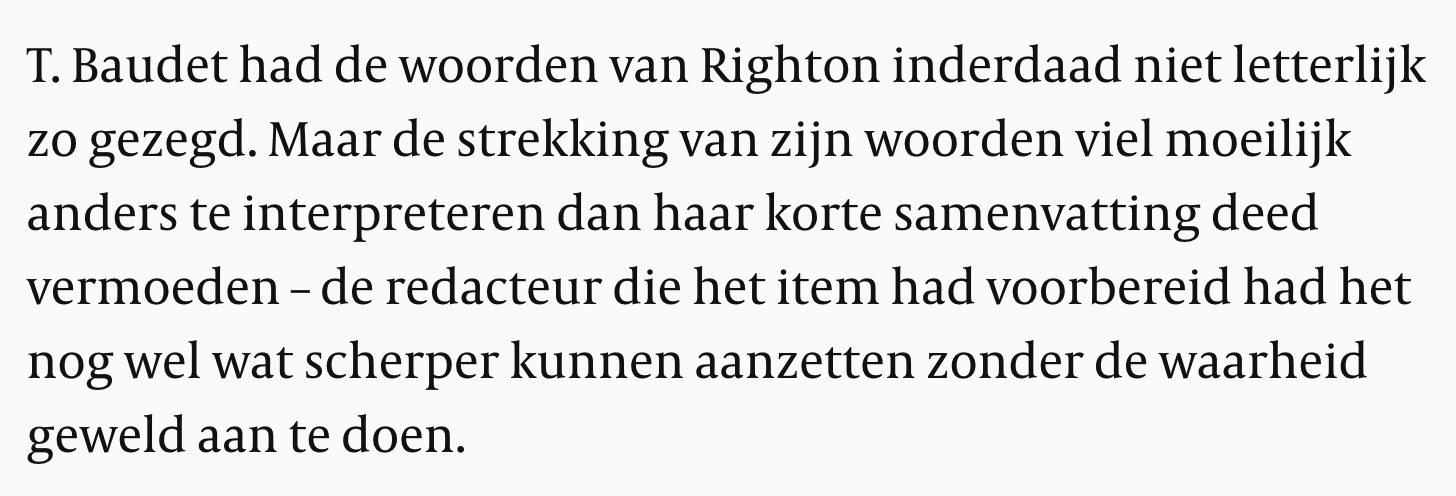 De kwestie kreeg al snel weer veilige Hilversumse proporties. Het Van Jole-zaakje bracht het kakelverse #metoo-gebeuren in gevaar. Eén fantast die #metoo ten val brengt, leg dat maar eens uit. En alle mannen maar lachen. Daarom was gisteravond de lucht alweer geklaard. De Volkskrant hield sowieso z'n bek over de hele situatie. Van Jole liet zich gebruiken door #metoo en hielp bewust leugens de wereld in te slingeren in een zeer gevoelige kwestie. In menig land zou dat het einde van een journalistieke carrière betekenen, maar niet in Nederland."