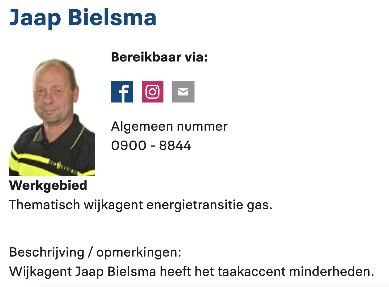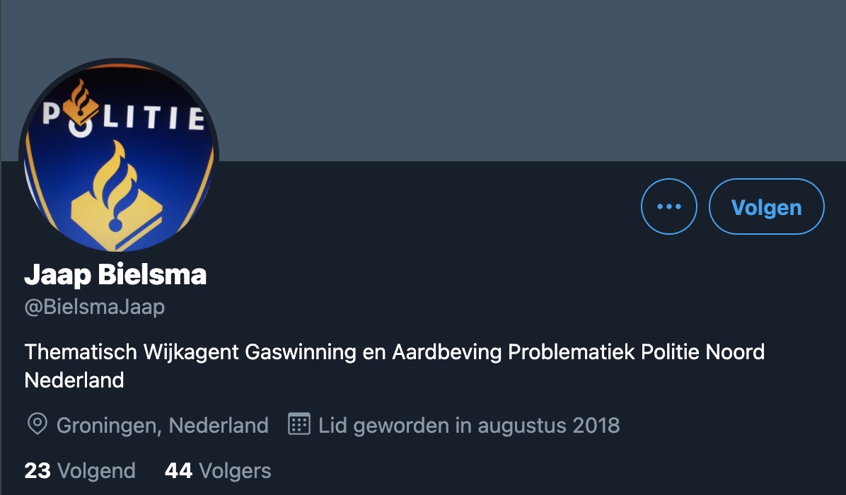 We zagen wat voorbij komen op de sociaalmedia en moesten urenlang bulderlachen en flauwe grapjes (gastapo, paddum-tisj) maken. En daarna gingen we checken of het ook echt zo was. Een wijkbromsnor (thematisch) die zich met energietransitie gas bemoeit. En we mogen concluderen: het is echt zo. Jaap Bielsma bestaat, en hij werkt in Appingedam. Voorheen was diender Bielsma "Thematisch Wijkagent Gaswinning en Aardbeving Problematiek Politie Noord Nederland" zo leert ons de -nog niet aangepaste- bio van zijn twitteraccount. Maar de gaskraan van Groningen gaat dicht, en daarom moet Jaap een andere functie-omschrijving, want de burgers in het Noorden van de CV naar de warmtepomp dwingen vergt een andere problematiek. Oh, en wijkagent Bielsma heeft ook nog "taakaccent minderheden", want die hebben ze daar ook, in 9901, wel 330.