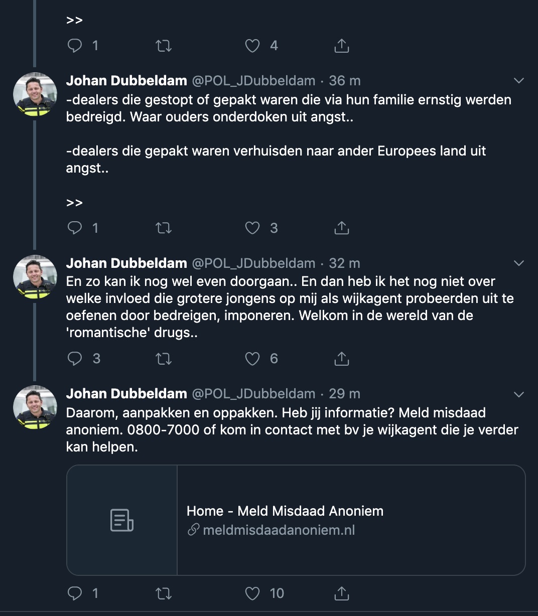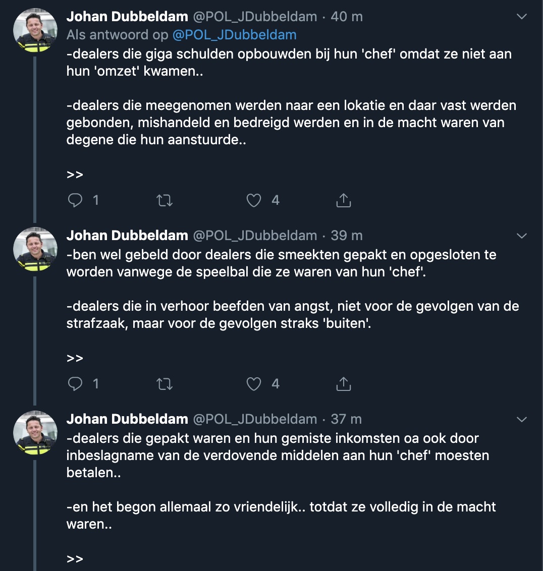 Op internet is onlangs Het Goorste Filmpje ooit opgedoken. Beelden zijn zo gruwelijk dat we ze niet gaan linken. Het betreft een afrekening in het drugsmilieu. Latijns-Amerikaans gokken we, want er wordt 'kartel' bij vermeldt. Een (levende) man ligt wijdbeens en naakt op de grond en zijn ballen en lul worden weggevreten door een pitbull-achtige hond, aangemoedigd door enthousiaste drugsdealertjes. Daar wilden we het bij laten. Ondertussen in eigen land... Agent Dubbeldam (uit Katwijk) reageert met dit draadje op het romantische verhaal in Het Parool over Jamal en Mo, die feestend dikke knaken verdienen met drugsdealen en binnenkort met pensioen kunnen omdat ze op 27-jarige leeftijd al 3 miljoen in kas hebben. Dus kinders, lees & leer van de wijkagent. En dan toch maar weer je best doen op sgool en in de Vomar. Met je losse hoofd eindigen op de stoep van een shisha-lounge kan altijd nog.