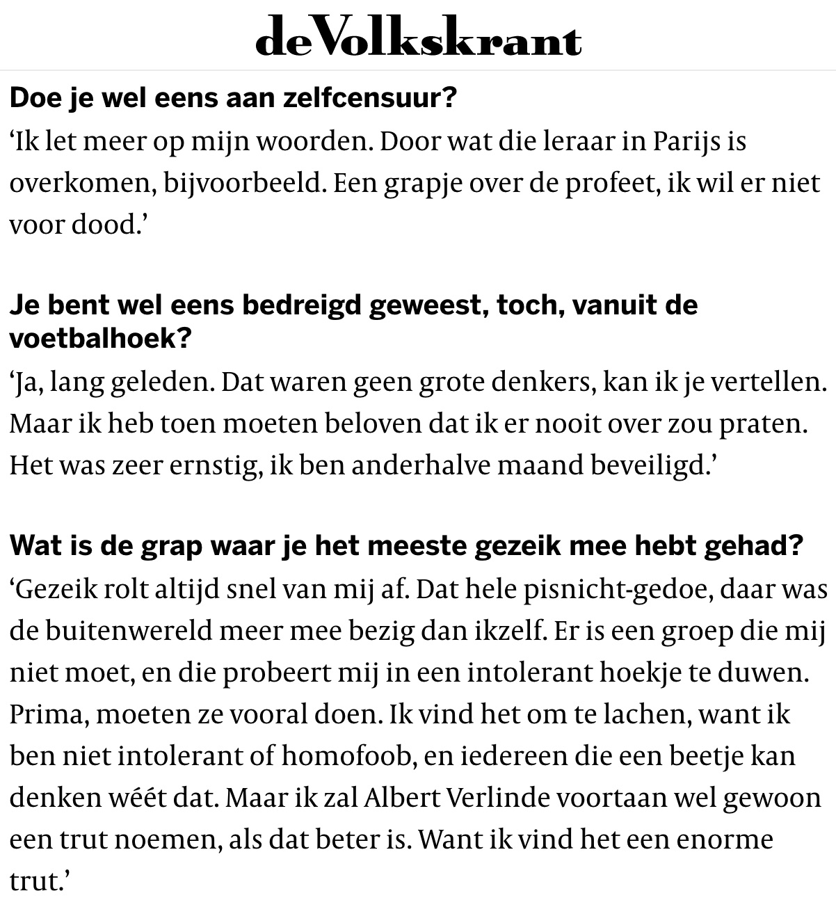 Veel erger is dat het de indruk bevestigt dat de islam een uitzonderingspositie heeft verworven in onze samenleving. Dat moslims hier, in Nederland, in 2018, vrijgesteld zijn van religiekritiek en dat hun profeet gevrijwaard wordt van spot, omdat hun profeet heiliger zou zijn dan al het andere. Dat is een doodenge, irrationele ontwikkeling die we al decennialang zien maar waar steeds minder mensen openlijk tegen durven terugduwen. Het creëert een parallelle samenleving waarin wederzijdse haat voedingsbodem vindt.