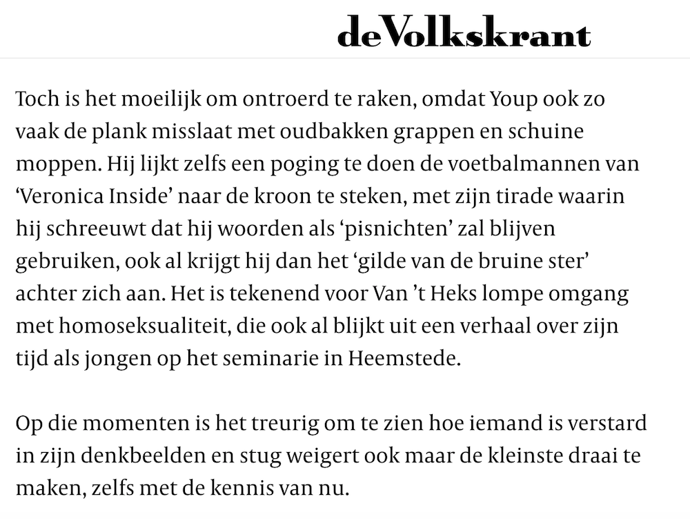 Zoals te doen gebruikelijk is Youp van’t Hek de allerlaatste om zich uit te spreken over de ophef van twee weken terug, maar eerlijk is eerlijk: hij vat de Veronica-rel tamelijk strak samen, Bucklert Arie Boomsma van een flat en haalt gewoon eens ouderwets uit naar het ‘almaar uitdijende gutmenschenbataljon’. We zijn bijna geneigd om een mooie NRC Rijncruise te boeken en een flesje veel te hoog geprijsde witte Moezelwijn met NRC-keurmerk te kopen om in een glazen NRC-karaf die als kristal is beprijsd te gieten. Bijna dan hè, want een krant dat zelf ook een blad uit de Boomsa–traditie der adverteerderbellers is, gunnen we natuurlijk geen cent.